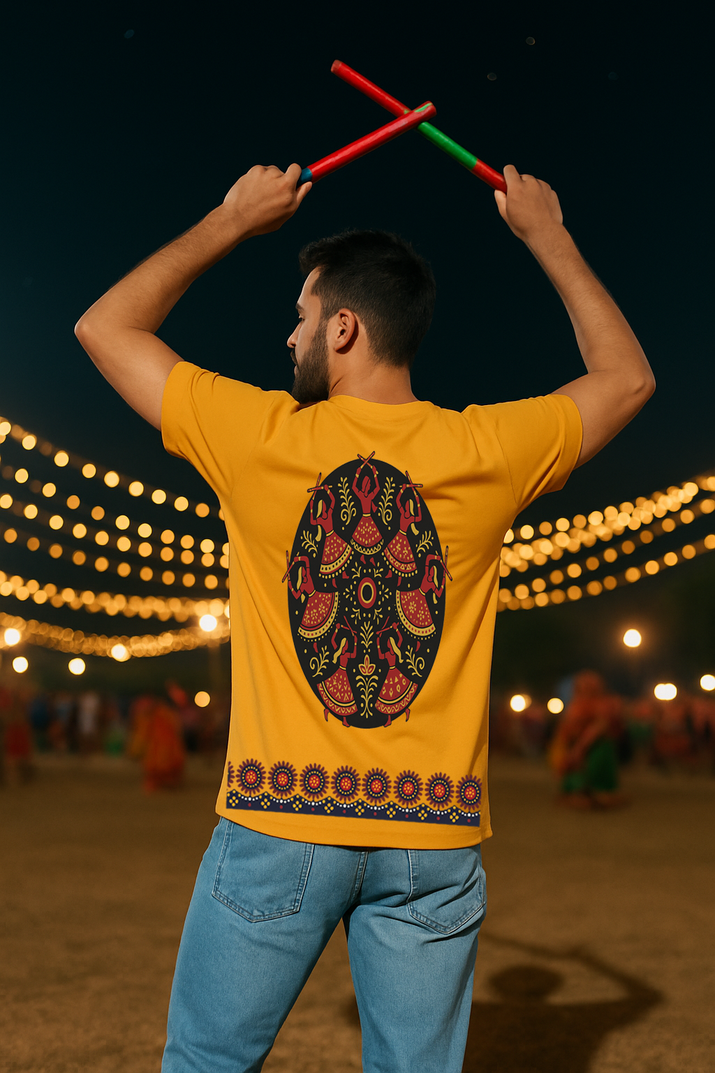 Bring harmony to your daily rhythm with the Peacock Grace BondStitch Tee. Featuring India’s national bird and Navratri’s cultural dance circles. Tailored in 180 GSM premium cotton, this Purposewear Tee blends deep mustard hues and heritage-inspired-style prints, honouring both elegance and joy.